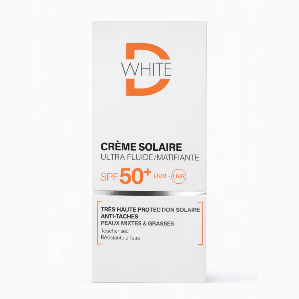 La D-White Ultra Fluide Matifiant SPF 50+ est une protection solaire conçue pour protéger efficacement la peau des UVA/UVB tout en contrôlant la brillance. Sa texture ultra fluide est idéale pour les peaux mixtes à grasses.