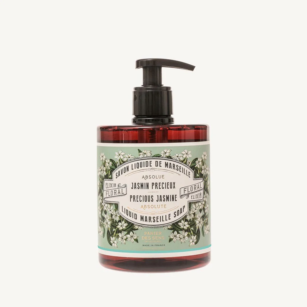 Ce savon de Marseille liquide au Jasmin nettoie en douceur tout en préservant l’équilibre naturel de la peau.